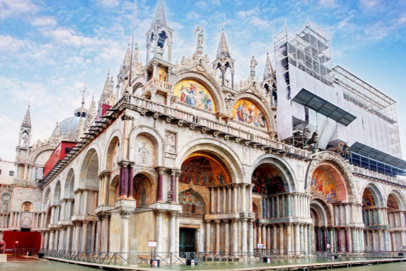 随后游览广场东侧充满拜占庭色彩的圣马可大教堂,这座教堂为纪念耶酥十二圣徒和收藏战利品而建,其后遭遇大火,历经修复变成现今的规模。位于教堂右侧的珍宝馆收藏、陈列有1204年十字军东征从君士坦丁堡带回来的战利品。
