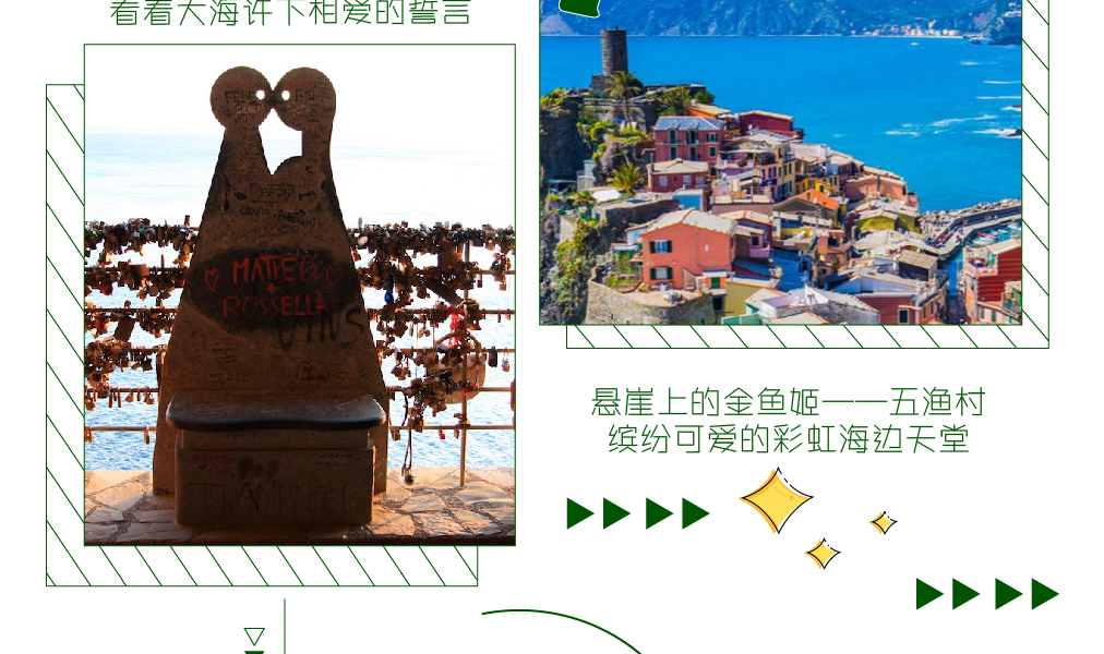 作为罗马帝国的重要战略海岸线,一直是“兵家必争之地”。自古以来连接五个渔村的是沿海的狭长小道,当然,近年开通了便捷的火车和渡船其中两个村庄里奥马焦雷和马纳罗拉之间的那段被冠名“爱之路”(Via dell’Amore),到此的情侣们可以在这里随意涂鸦。