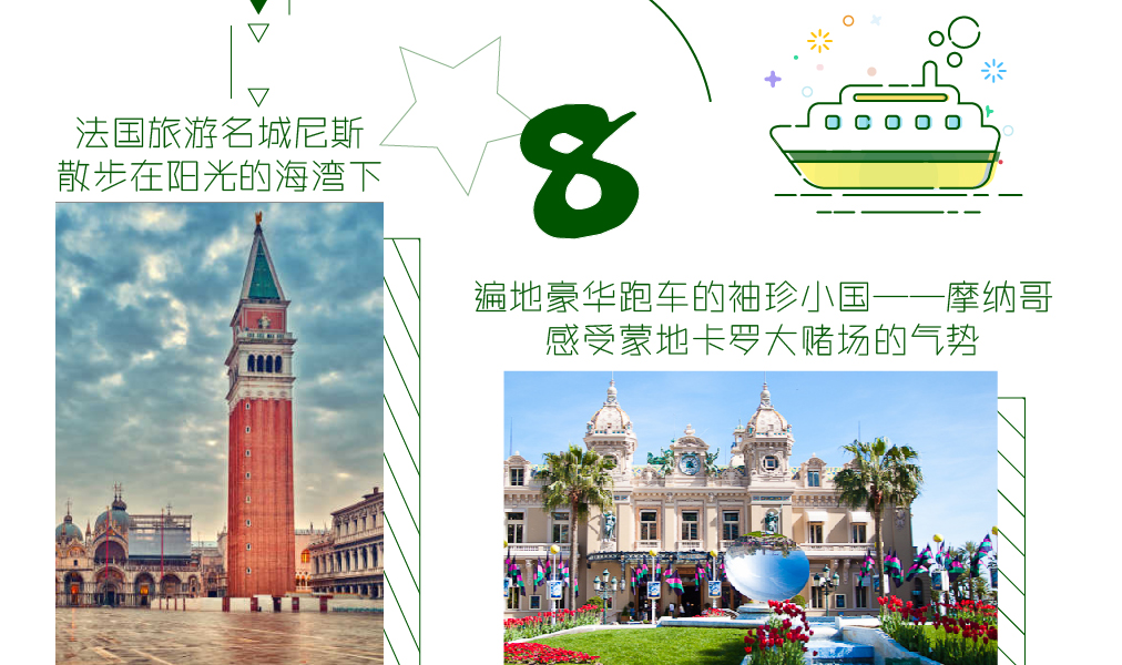 再沿高崖之路前往法国旅游名城尼斯,在天使湾体验什么叫拥有永恒之美的蔚蓝海岸。这里海水如蓝色宝石,晶莹剔透,海天一色,无限完美。连绵几十公里的地中海海岸线,碧海蓝天加上沿岸那星星点点独具特色的城镇,是多少人梦想的天堂。