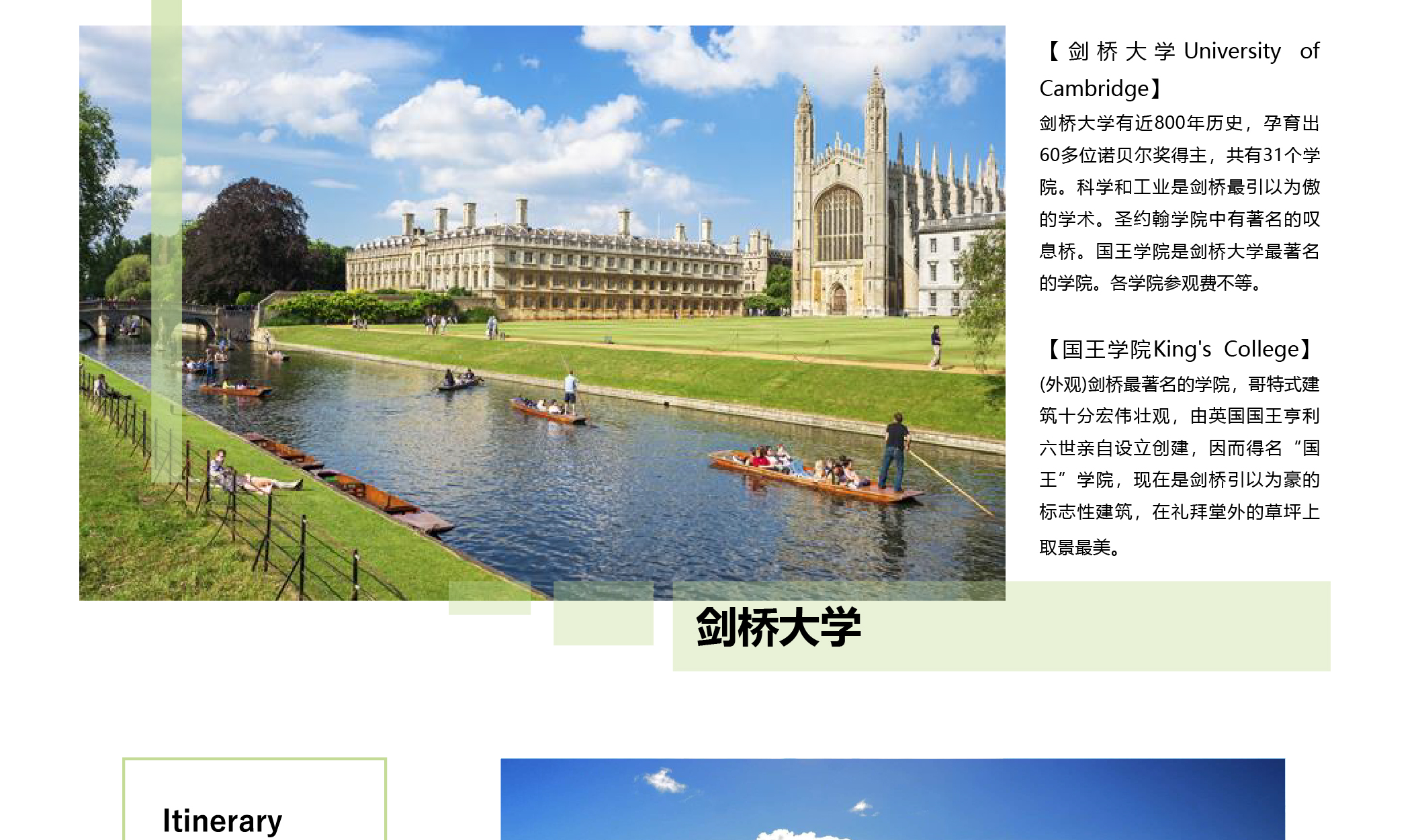 【剑桥Cambridge】以剑桥大学闻名,位于伦敦北。乌斯河穿过,弥尔顿、拜伦等人在这就读。与牛津“大学中有城市”不同的是,这里被称作“城市中有大学”。