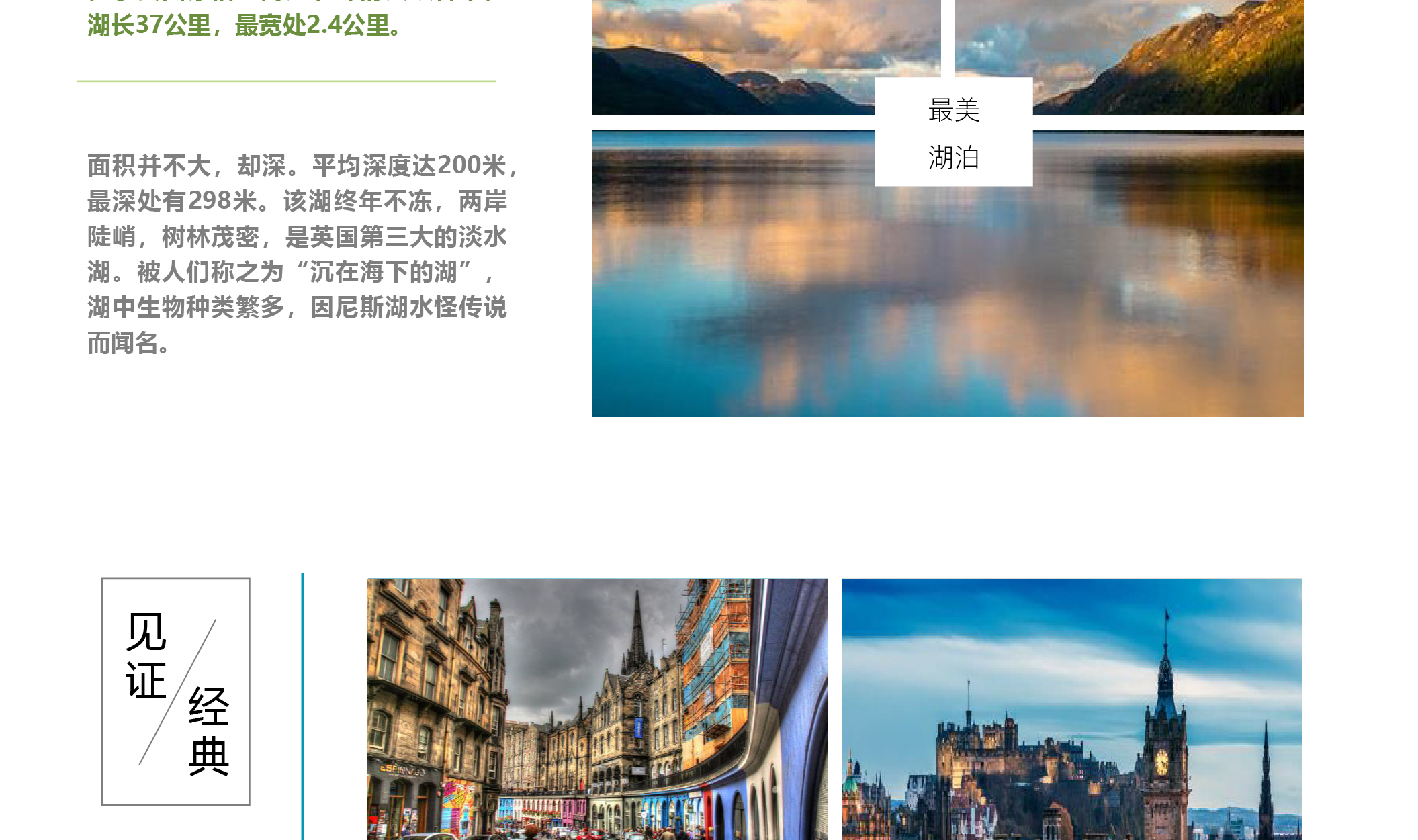 【尼斯湖Loch Ness】位于英国苏格兰高原北部的大峡谷中,湖长37公里,最宽处2.4公里。面积并不大,却深。平均深度达200米,最深处有298米。该湖终年不冻,两岸陡峭,树林茂密,是英国第三大的淡水湖。被人们称之为“沉在海下的湖”,湖中生物种类繁多,因尼斯湖水怪传说而闻名。