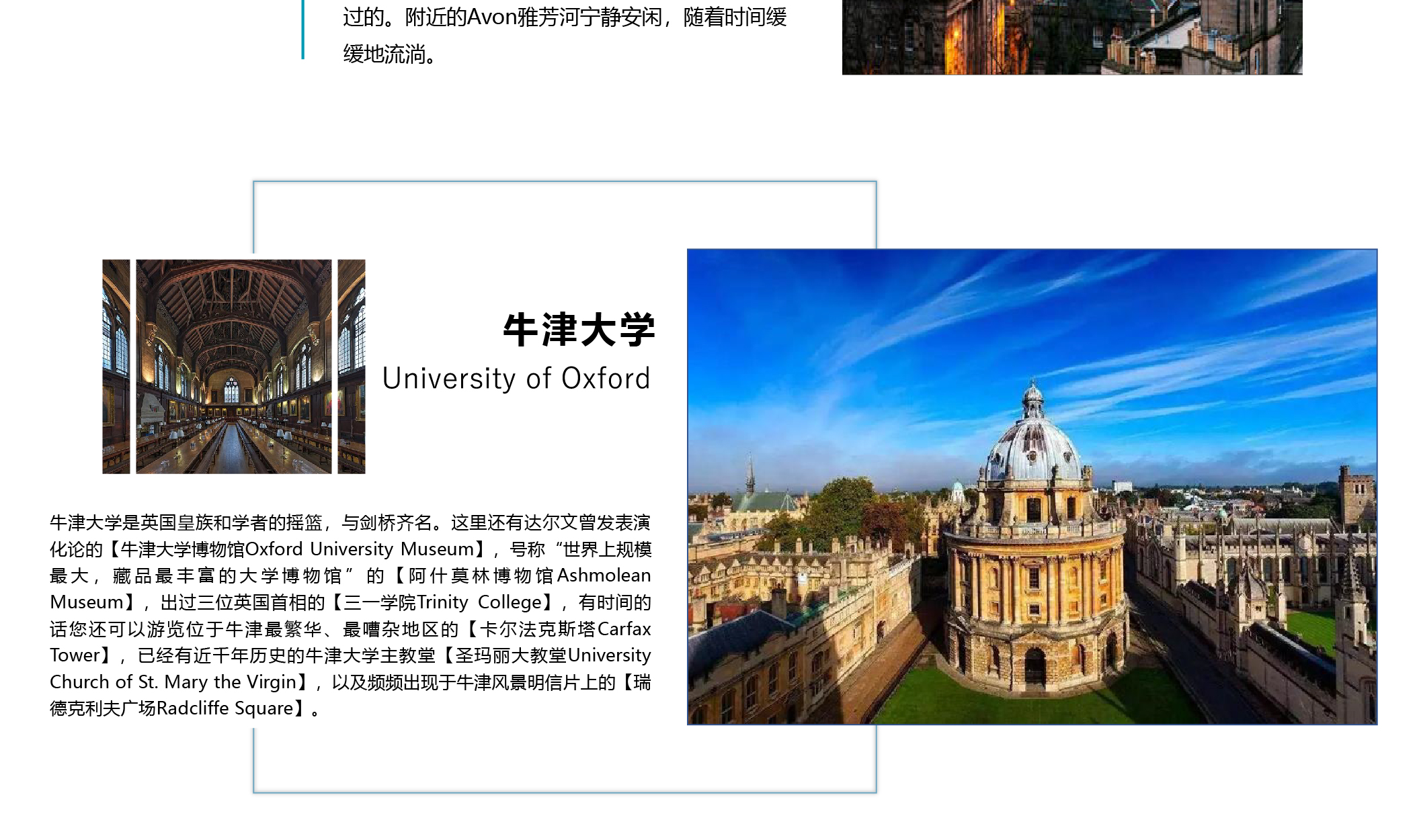 【牛津大学University of Oxford】是英国皇族和学者的摇篮,与剑桥齐名。这里还有达尔文曾发表演化论的【牛津大学博物馆Oxford University Museum】,号称“世界上规模最大,藏品最丰富的大学博物馆”的【阿什莫林博物馆Ashmolean Museum】,出过三位英国首相的【三一学院Trinity College】,有时间的话您还可以游览位于牛津最繁华、最嘈杂地区的【卡尔法克斯塔Carfax Tower】,已经有近千年历史的牛津大学主教堂【圣玛丽大教堂University Church of St. Mary the Virgin】,以及频频出现于牛津风景明信片上的【瑞德克利夫广场Radcliffe Square】。