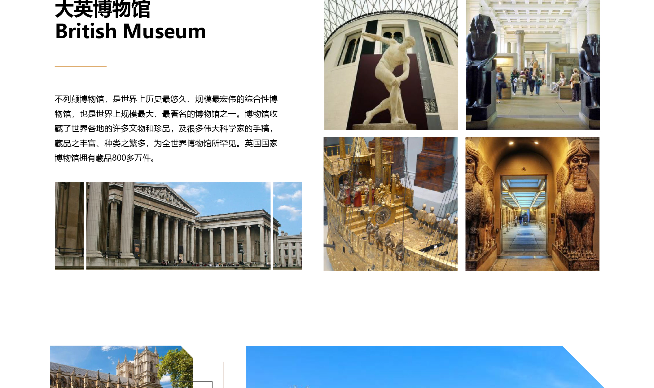 又名不列颠博物馆,是世界上历史最悠久、规模最宏伟的综合性博物馆,也是世界上规模最大、最著名的博物馆之一。博物馆收藏了世界各地的许多文物和珍品,及很多伟大科学家的手稿,藏品之丰富、种类之繁多,为全世界博物馆所罕见。英国国家博物馆拥有藏品800多万件。