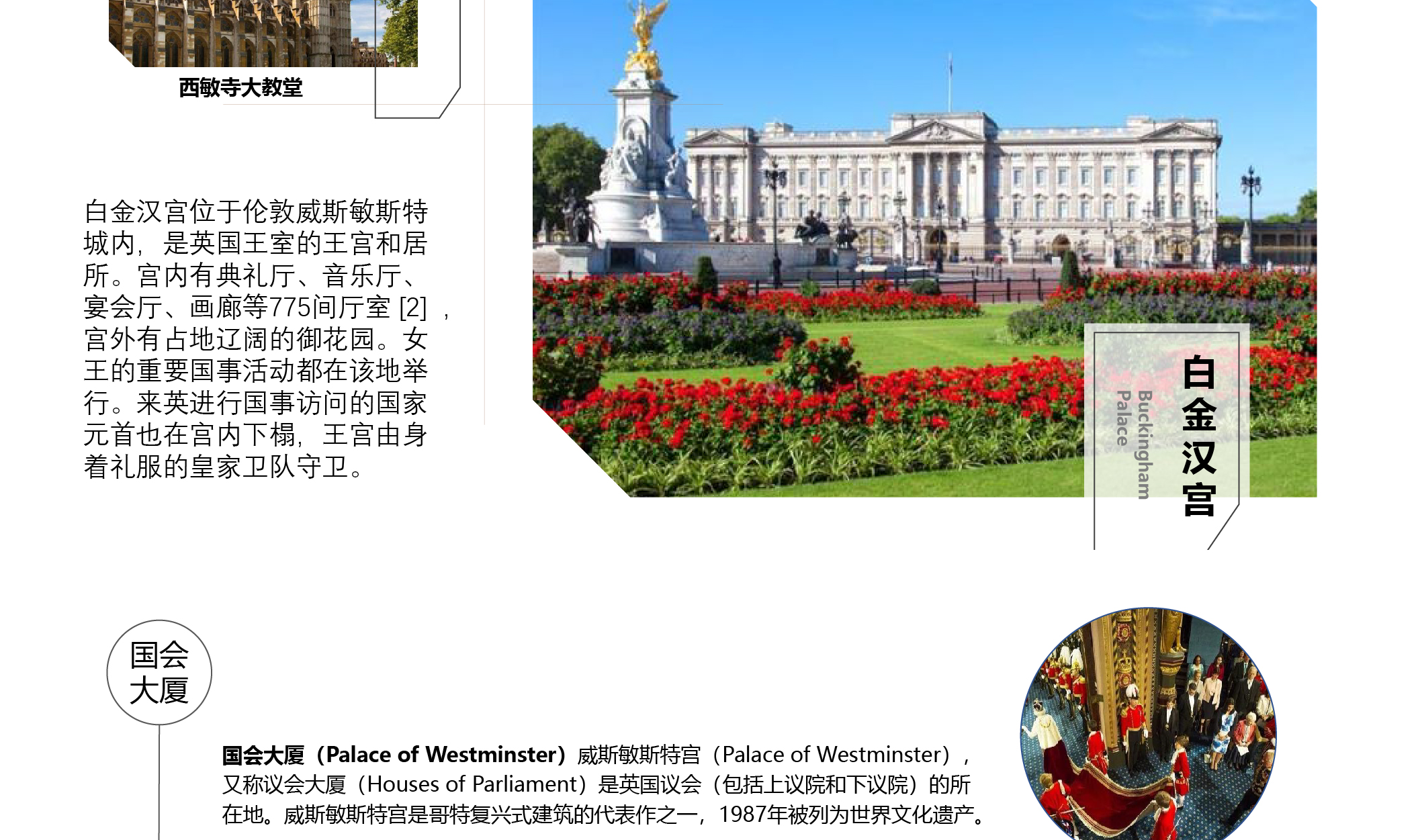 【白金汉宫Buckingham Palace】(外观)白金汉宫位于英国首都伦敦,对外开放,是英国的皇家居所和女王办公地,也是观看卫队换岗的最好地点。每天清晨都会进行著名的禁卫军交接典礼,成为英国王室文化的一大景观。