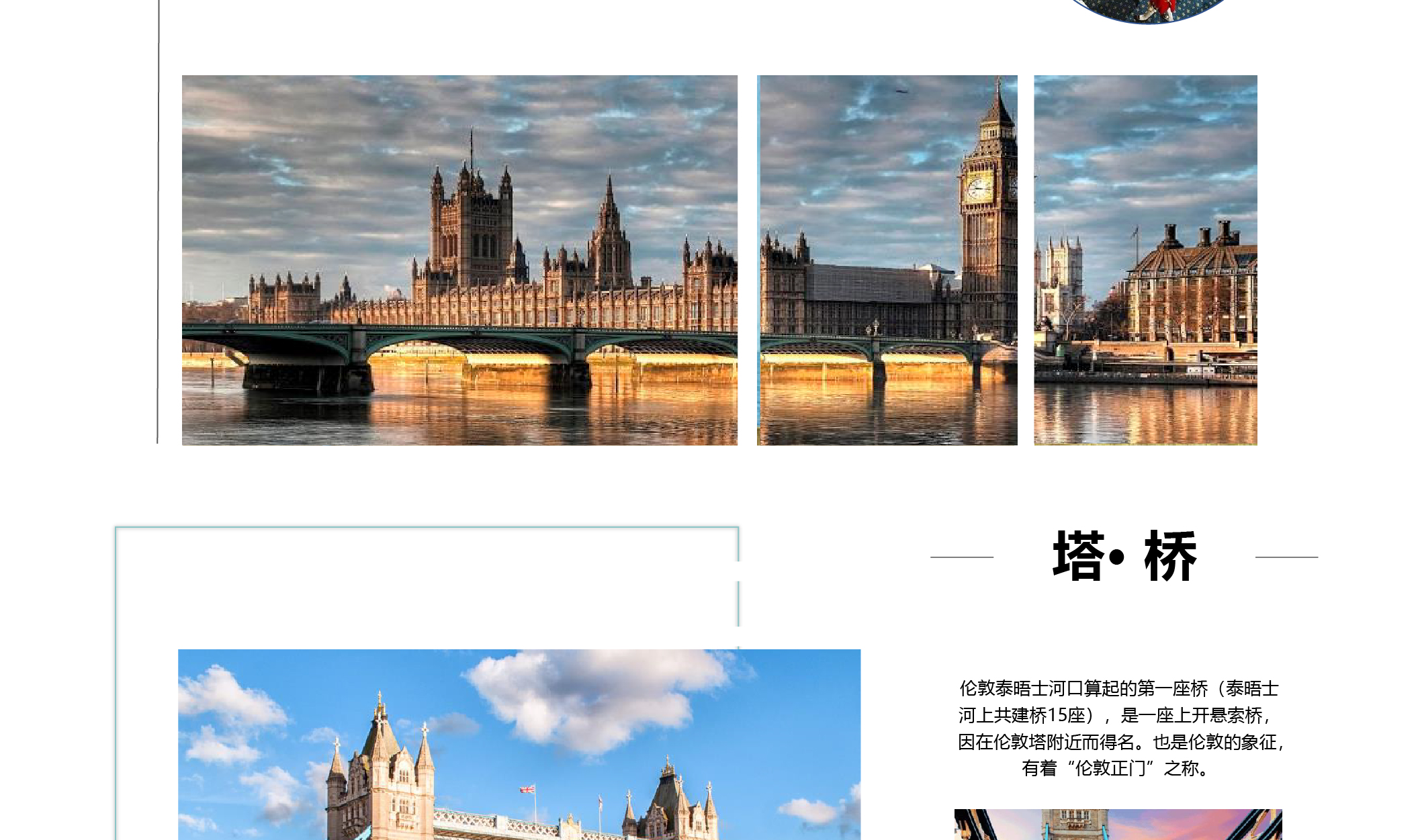 【塔桥Tower Bridge】伦敦泰晤士河口算起的第一座桥(泰晤士河上共建桥15座),是一座上开悬索桥,因在伦敦塔附近而得名。也是伦敦的象征,有着“伦敦正门”之称。