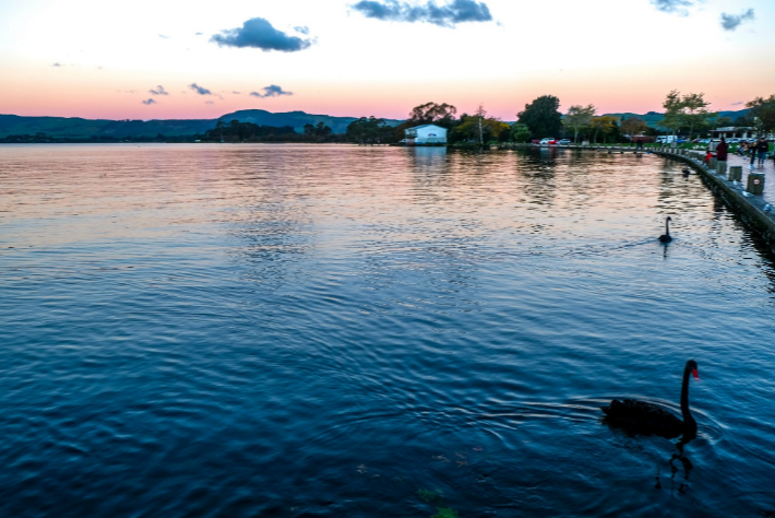 【罗托鲁瓦湖】:湖水清澈湛蓝,湖畔有成群海鸥、野鸭、黑天鹅在水中游戏。