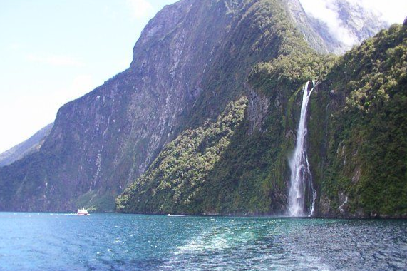 新西兰的所有峡湾中 简单而美丽的就是米尔福德峡湾(Milford Sound),”Sound” 的意思是很深的峡湾。 走进【峡湾国家公园】的游人大部分要乘船游览米尔福德峡湾。峡湾两岸是陡峭的岩壁。从海面垂直拔地而起的米特峰和象山高度分别为1692米和1517米,表成公园 具象征性的景观。无数条瀑布挂在峭壁上,像天河一样飞泻下来直入大海,其中 大的博恩瀑布落差达160米。