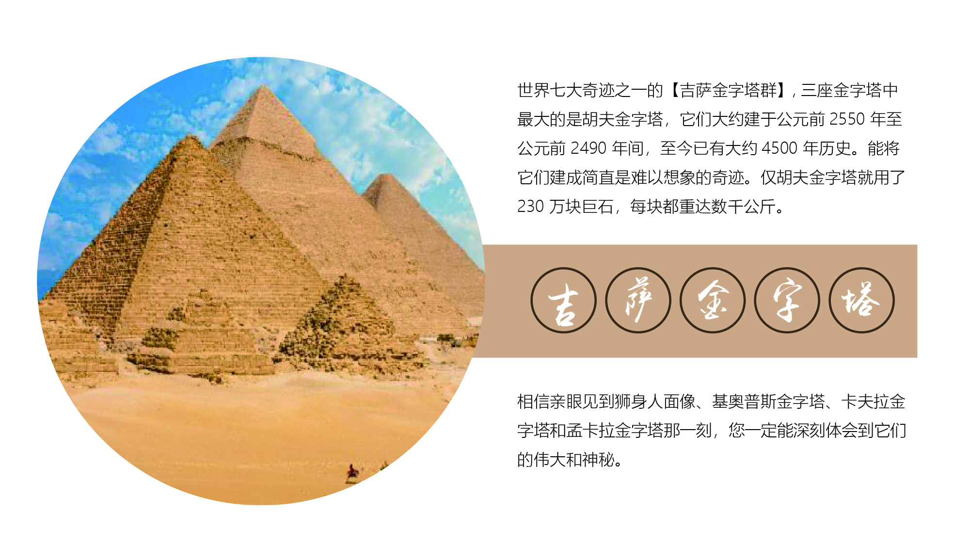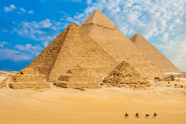 世界七大奇迹之一【吉萨金字塔群】 酒店自助早餐后,前往【古时首都-孟菲斯】:位于埃及尼罗河三角洲南端,从公元前3100年前起就是埃及最古老的首都,定都且长达800年之久。随后前往参观世界七大奇迹之一的【吉萨金字塔群】,参观保存最完好的由第四王朝的2位皇帝胡夫(Khufu)、海夫拉(Khafra)建造的【胡夫金字塔】以及【海夫拉金字塔】:于公园前2600年—公元前2500年建造的。