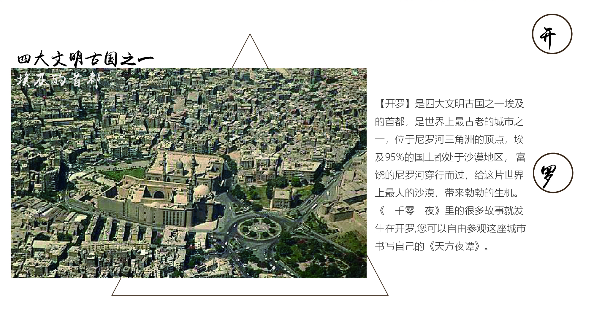 【开罗】是四大文明古国之一埃及的首都,是世界上最古老的城市之一,位于尼罗河三角洲的顶点,埃及95%的国土都处于沙漠地区, 富饶的尼罗河穿行而过,给这片世界上最大的沙漠,带来勃勃的生机。《一千零一夜》里的很多故事就发生在开罗,您可以自由参观这座城市书写自己的《天方夜谭》。