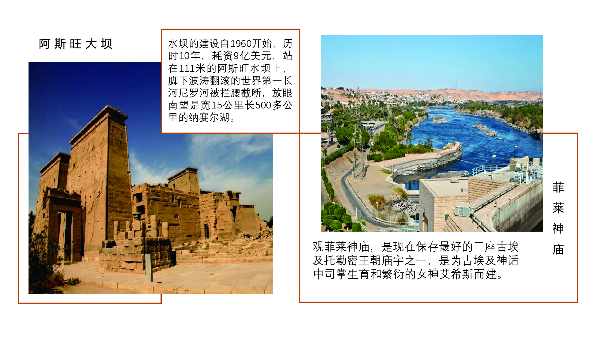 【阿斯旺大坝】》【菲莱神庙】》【尼罗河】 清晨抵达后,驱车前往阿斯旺大坝(外观):水坝的建设自1960开始,历时10年,耗资9亿美元,站在111米的阿斯旺水坝上,脚下波涛翻滚的世界第一长河尼罗河被拦腰截断,放眼南望是宽15公里长500多公里的纳赛尔湖。