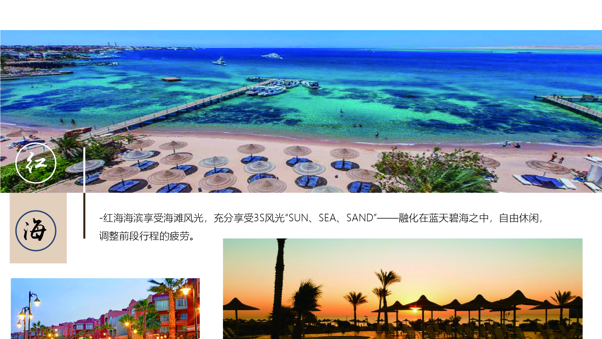 于红海海滨享受海滩风光,充分享受3S风光“SUN、SEA、SAND”——融化在蓝天碧海之中,自由休闲,调整前段行程的疲劳。