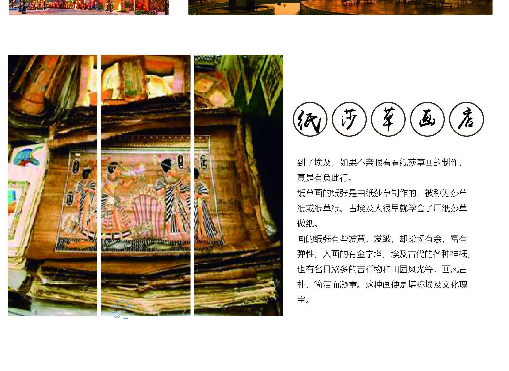 纸莎草画店+香精店 早餐后前往埃及著名的纸莎草画店(约1小时)和香精店(约1小时)纸莎草曾一度面临灭绝的危险,今日在纸莎草画店里可观看传统的造纸过程。之后乘车前往机场返回巴黎。