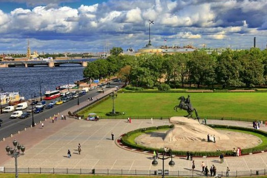 之后游览十二月党人广场,十二月党人广场,坐落在圣彼得堡涅瓦河岸,邻近海军司令部大楼,广场中央有一个圆形的大草坪,中央竖立着彼得大帝青铜骑士像。