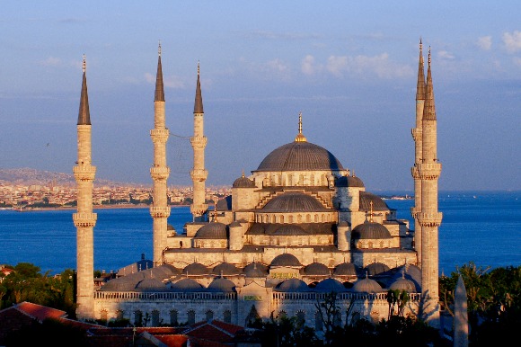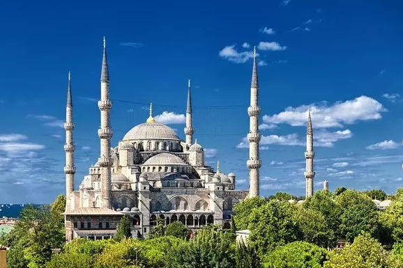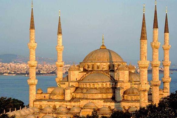 【蓝色清真寺】是伊斯坦布尔的地标式建筑,地处旧市街的中心,始建于1609年奥斯曼帝国时期,花费了七年时间建成,气势恢宏,造型奢华独特,是世界十大奇景之一。该寺的墙壁自其高度的1/3以上都使用了土耳其瓷器名镇——伊兹尼克(Izhik)烧制的蓝彩釉贴瓷,瓷片以白色为底,上面刻着丰富的花纹和图案,共有21043片。这些瓷片的蓝色使得整个清真寺内都充满了蓝色,所以人们称之为蓝色清真寺。蓝色清真寺是伊斯坦布尔最大的圆顶建筑,三十多座圆顶层层升高,向直径达41公尺的中央圆顶聚拢,庞大而优雅。寺的四周建有六座“宣礼塔”,是全世界唯一拥有六座高塔的清真寺。