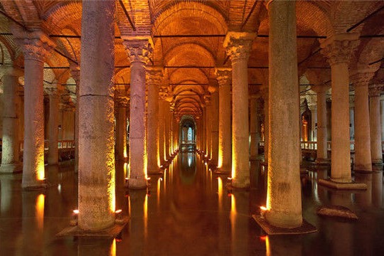 【 耶莱巴坦地下水宫】》【大巴扎集市】 【耶莱巴坦地下水宫】位于圣索菲亚教堂斜对面的地下水宫,建于公元532年,是拜占庭时期到奥斯曼帝国时期的地下蓄水池。这座140米长、70米宽的地下水池可储十万吨水,可供当时全城人喝一个月。至今还有鱼在此游弋。除了作为古老的蓄水池,这里还曾作为军事弹药库使用。如今,这里可以称得上是伊斯坦布尔最浪漫、最神秘的景点之一。336根巨大石柱构建的巨大宫殿,每根柱子上都雕刻着精美的图案。宫殿里面有两个倒置的【美杜莎石柱】,是1984年改建时,人们从底部厚达2米的淤泥中发掘了出来。此外那悠长旷远的滴水声加之那些诡异的传说,仿佛带你步入了另一个莫测的世界。