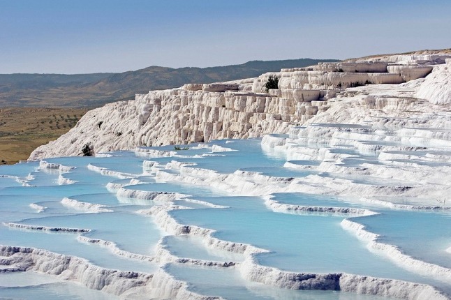 【棉花堡】位于土耳其Denizli市的西南部,是远近闻名的温泉度假胜地,此地不仅有上千年的天然温泉,更有这种古怪的好似棉花一样的山丘。大自然的鬼斧神工制造出了如此美妙的仙境。土耳其文Pamuk表示棉花,Kale表示城堡,所以Pamukkale就叫棉花堡。土耳其人叫他世界第八大奇迹,来这里参观没有任何限制。棉花堡是自然的一个奇迹,有温泉和白色的悬崖,水流顺着悬崖冲击而下,所以形成棉颜色的钟乳石和盆地。这种钙化地貌是最多的,绵延不断。这样的环境不仅仅是感情的寄托而且对身体有疗效。这里的水被认为是宝贵的,可以治病的。游客都要带些谁回去,它保持包含着了我们一直找寻的这个世界的魔力和和平。