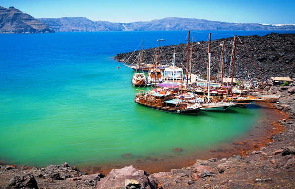 【卡美尼岛Nea Kameni】喜欢继续探险的游客可以自选下午坐船到附近的著名活火山卡美尼岛去看一看,在80多度高温火山口盛开的黄色小花是如何顽强绽放美丽的。