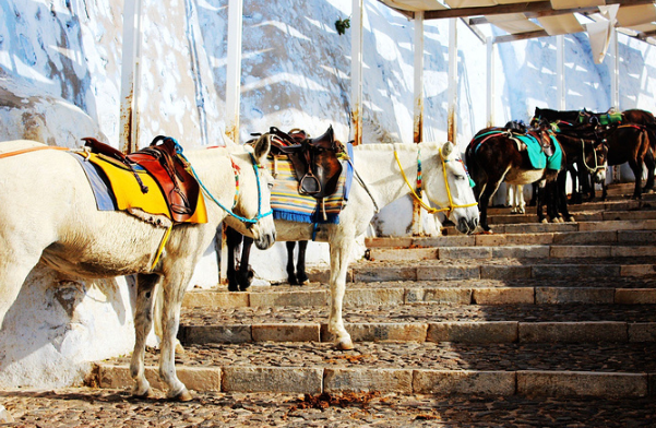 【老码头】沿着小镇漫步,我们还可以到悬崖底的老码头去看看,这里是通往圣托里尼其他小岛的要道,所以比较热闹繁忙。然而到达老码头的方式也很特别,喜欢挑战的游客可以选择【★悬崖骑驴】慢慢到达码头,体验独特的小岛趣味——还记得《牛仔裤的夏天》女主角之一莉娜在费拉时,骑着小毛驴一边欣赏蓝白美景,一边享受着阳光的惬意吗?而喜欢方便的游客可以直接乘坐【★观光缆车】到达码头,把更多的时间留给码头闹景。