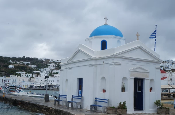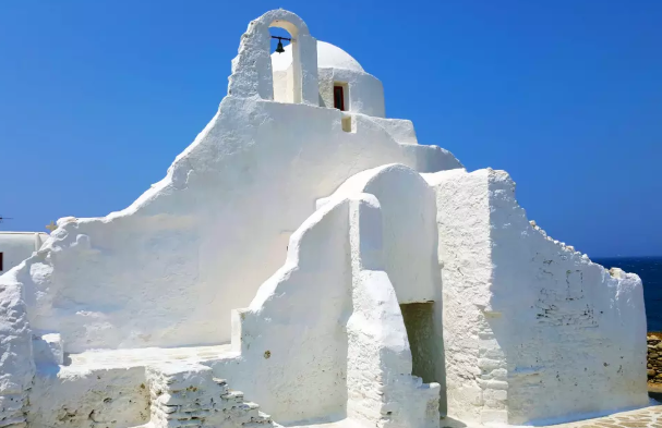 【帕拉波尔提亚尼教堂Paraportiani Church】是米科诺斯岛的标志,为拜占庭风格,也是米克诺斯明信片上的常客,因其通体纯白又被叫做“冰激凌教堂”。它是由五座独立的小教堂集合组成的,外形最漂亮的那一座是圣玛利亚教堂,抬头望去,教堂上方是拱门型的顶,拱门下挂着一个钟,优美独特。