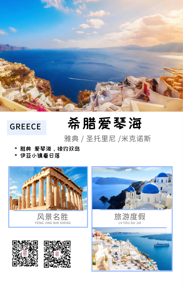 【日落爱琴海】到了傍晚时分我们将在这里观看到全世界最美的落日——日落爱琴海美景,游客总会蜂拥而来,找一个观赏日落的最佳位置静静地坐上一小时,看着太阳慢慢的落下,消失在海平线上后游客们总会情不自禁的拍手鼓掌,赞美这美丽的夕阳。这里的景色被许多艺术家、摄影家作为灵感的来源。白色的房子、蓝顶的教堂、传统的风车在夕阳的照耀下总是能让人陶醉。