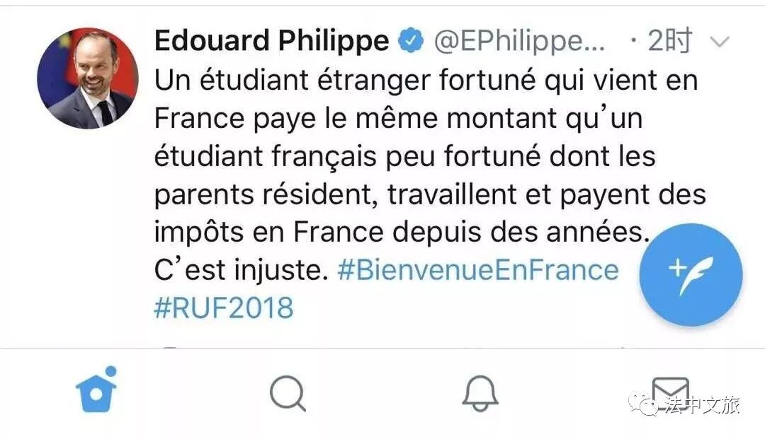 而总理却在推文上这样说:“一个来到法国的家境富裕的学生,和父母居住、工作在法国,并且在法国交税的法国学生付一样的注册费。这是不公平的。”