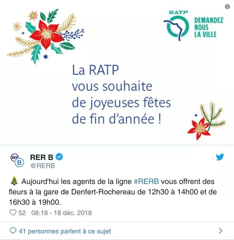 这周二,RER B 线的Denfert-Rochereau地铁口也有一场温馨的送花活动。这也是RATP的活动之一,工作人员提前将礼物集中到地铁口外的广场上之后随机送给搭乘地铁出来的乘客们。在12月31日和1月1日也将有机会收到地铁工作人员送来的书签哦。